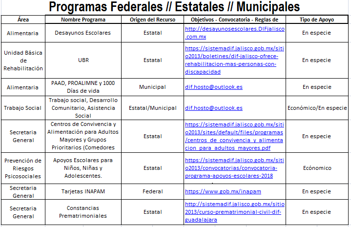 A continuación, se publica la descripción de los programas federales, estatales y municipales que actualmente lleva a cabo el sistema DIF municipal de Hostotipaquillo: